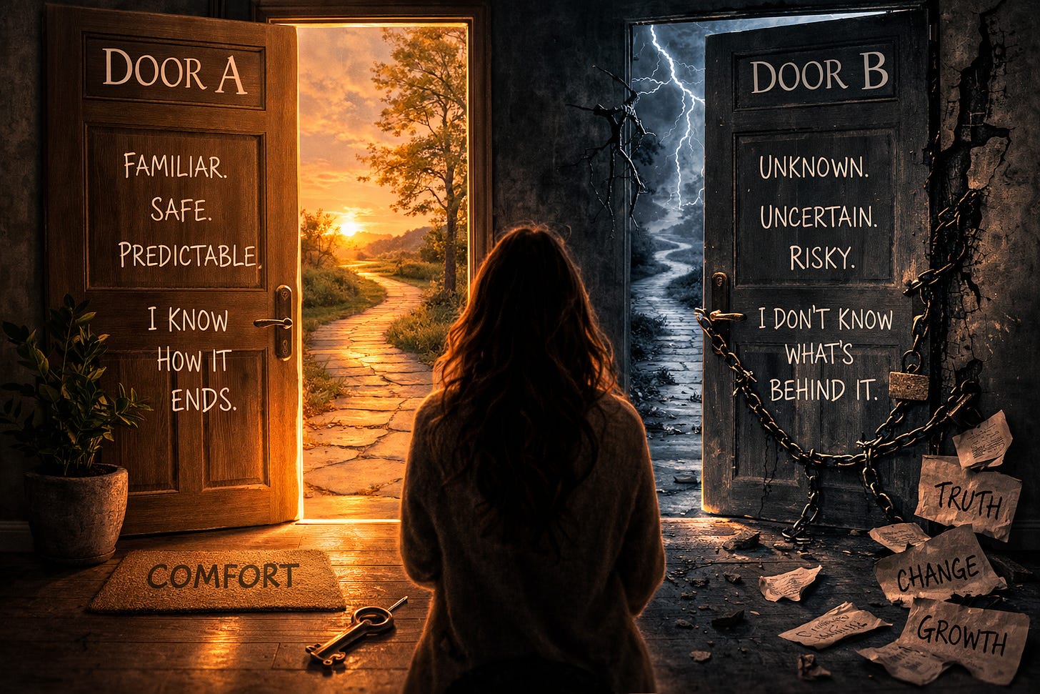 I know exactly what’s behind it. The same patterns. The same defenses. The same quiet ways of steering the conversation away from the thing that scares me most. Door A is comfortable. Predictable. It lets me …